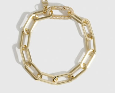 8" long, with a gorgeous pave crystal clasp. A thick layer of 14k gold shines lusterously under an e-coat top layer for long lasting wear.